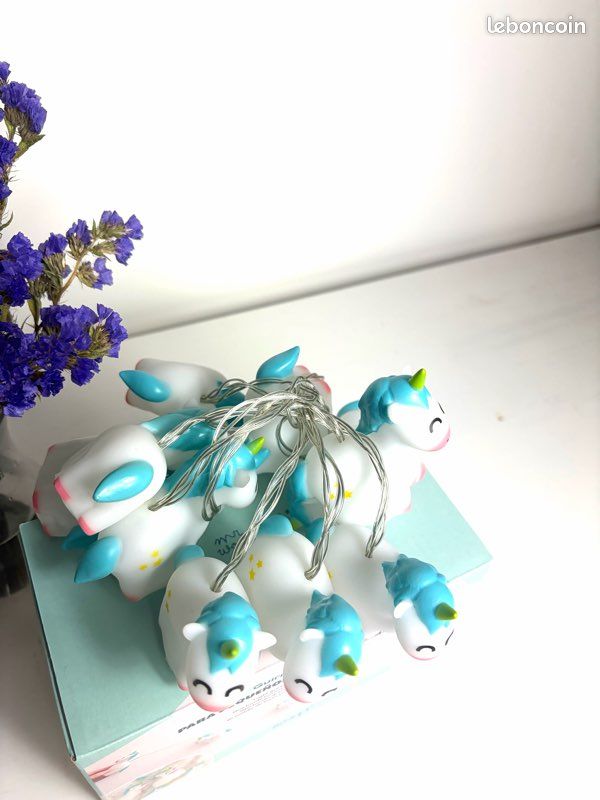 Les fans de licornes vont adorer cette guirlande lumineuse ! Elle fait 1,5 m de long avec 10 petites licornes LED qui s'allument doucement. Alimentation par 2 piles AA (non fournies), donc pas de fil électrique, vous pouvez l'accrocher partout. Parfaite pour décorer la chambre d'une enfant, un sapin de Noël, une fête d'anniversaire, Halloween, ou pour créer une ambiance magique. Les LED ne chauffent pas, sont économes et durables. Vous pouvez l'enrouler autour d'un lit, la mettre sur un mur, une fenêtre, une tête de lit... Très légère et facile à ranger. Un cadeau idéal pour faire rêver. La guirlande est souple, les licornes sont en plastique résistant. Attention, ne convient pas aux très jeunes enfants (petites pièces). Livrée prête à l'emploi, il suffit d'insérer les piles. Magique !