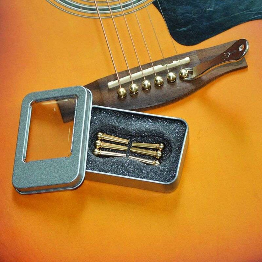 Vous voulez améliorer le son et la tenue des cordes de votre guitare acoustique ? Remplacez vos vieilles chevilles en plastique ou en ébène par ce lot de 6 chevilles de chevalet en laiton pur de OriGlam. D'une longueur de 28 mm, elles sont plus denses et rigides, ce qui permet un meilleur transfert des vibrations du cordage vers la table d'harmonie. Résultat ? Un son plus clair, plus brillant, avec un meilleur sustain (la note dure plus longtemps) et une stabilité accrue, surtout pour les fréquences basses. Le laiton est très durable et ne risque pas de casser comme l'os ou le Tusq. Le placage or cuivré leur donne un look pro et les protège de l'oxydation. Compatibles avec la plupart des guitares acoustiques/folk (comme Martin, Taylor, etc.), elles sont faciles à installer. Une mise à niveau simple et peu coûteuse pour un son vraiment plus pro !