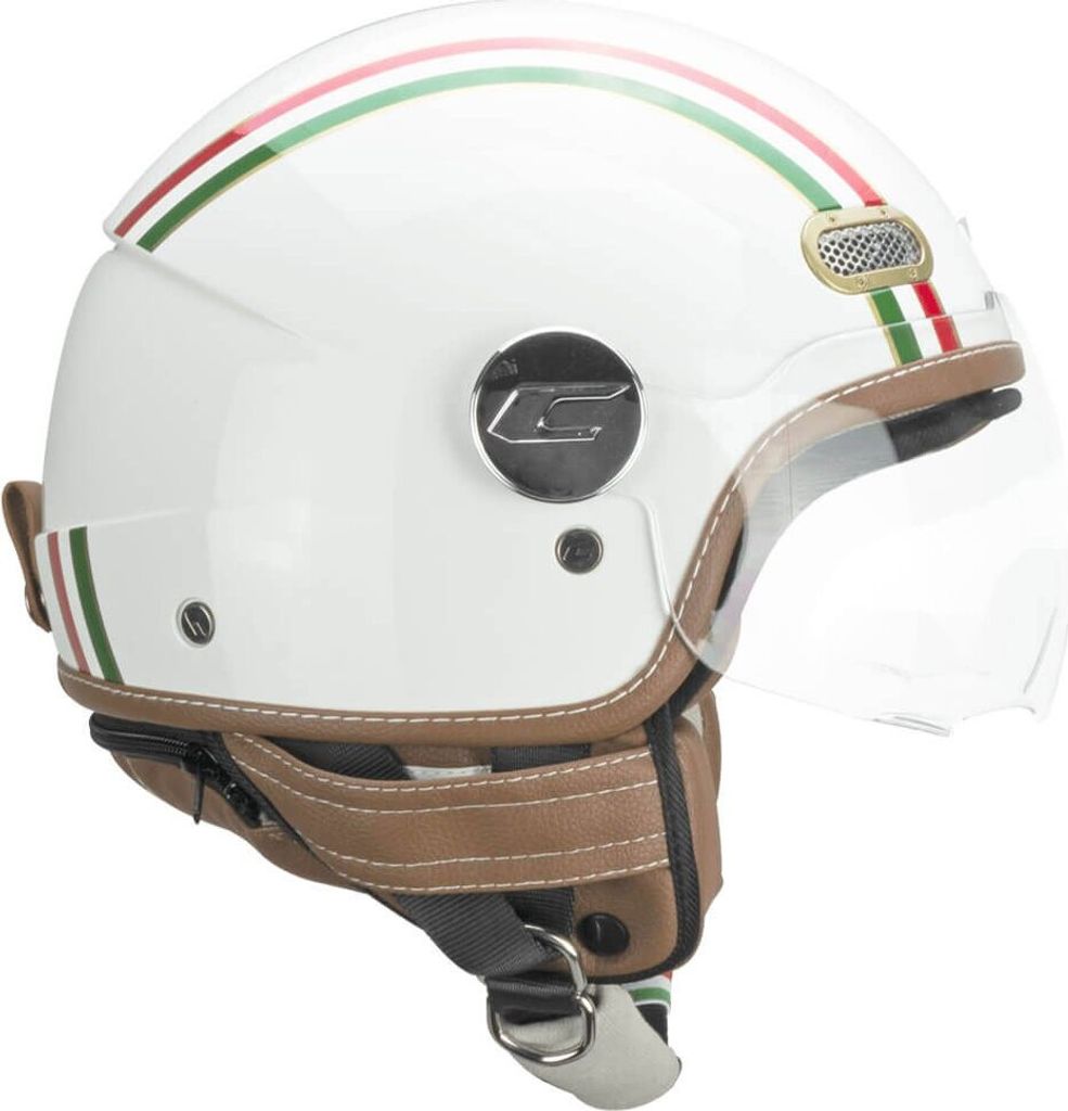 Style rétro, performance moderne : le casque jet CGM Pix allie l'élégance italienne à une sécurité optimale. Homologué ECE 22.06, il est extrêmement compact et léger. Les prises d'air avant en métal et les extracteurs arrière assurent une bonne ventilation. L'intérieur thermoformé est entièrement amovible et lavable, avec un protège-nuque ajustable. La visière est interchangeable (longue ou profilée) selon vos préférences. Équipé d'une boucle micrométrique, d'un anneau antivol et d'un passe-lunettes. Design avec détails en cuir synthétique vintage. Disponible en plusieurs coloris (ici vert/blanc/rouge) et en taille XL (58 cm de tour de tête). Confort, style et protection – tout pour rouler en toute sérénité.
