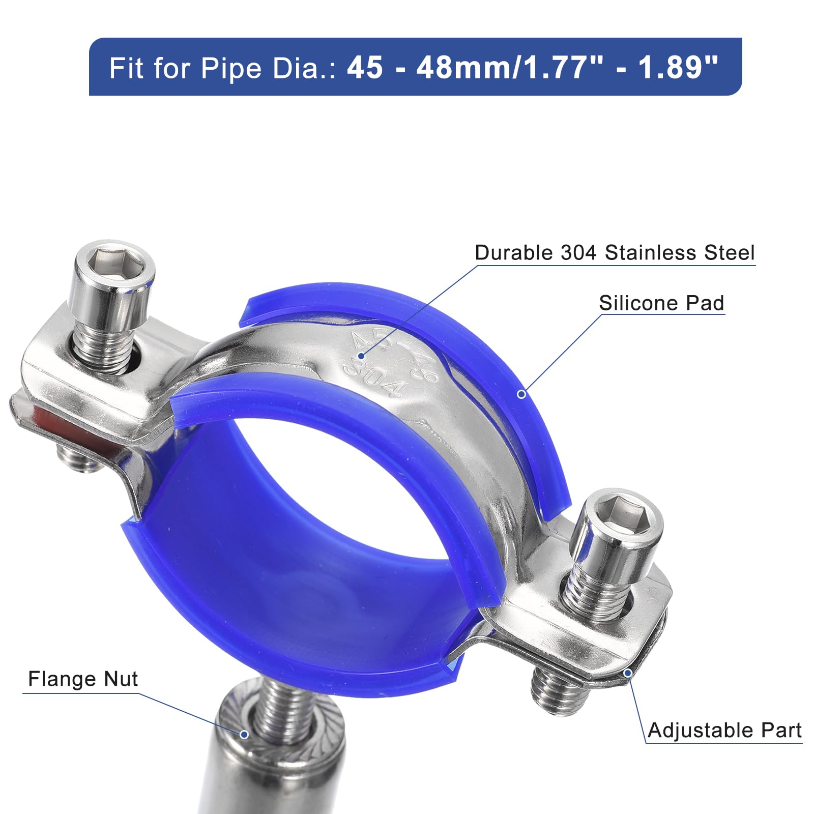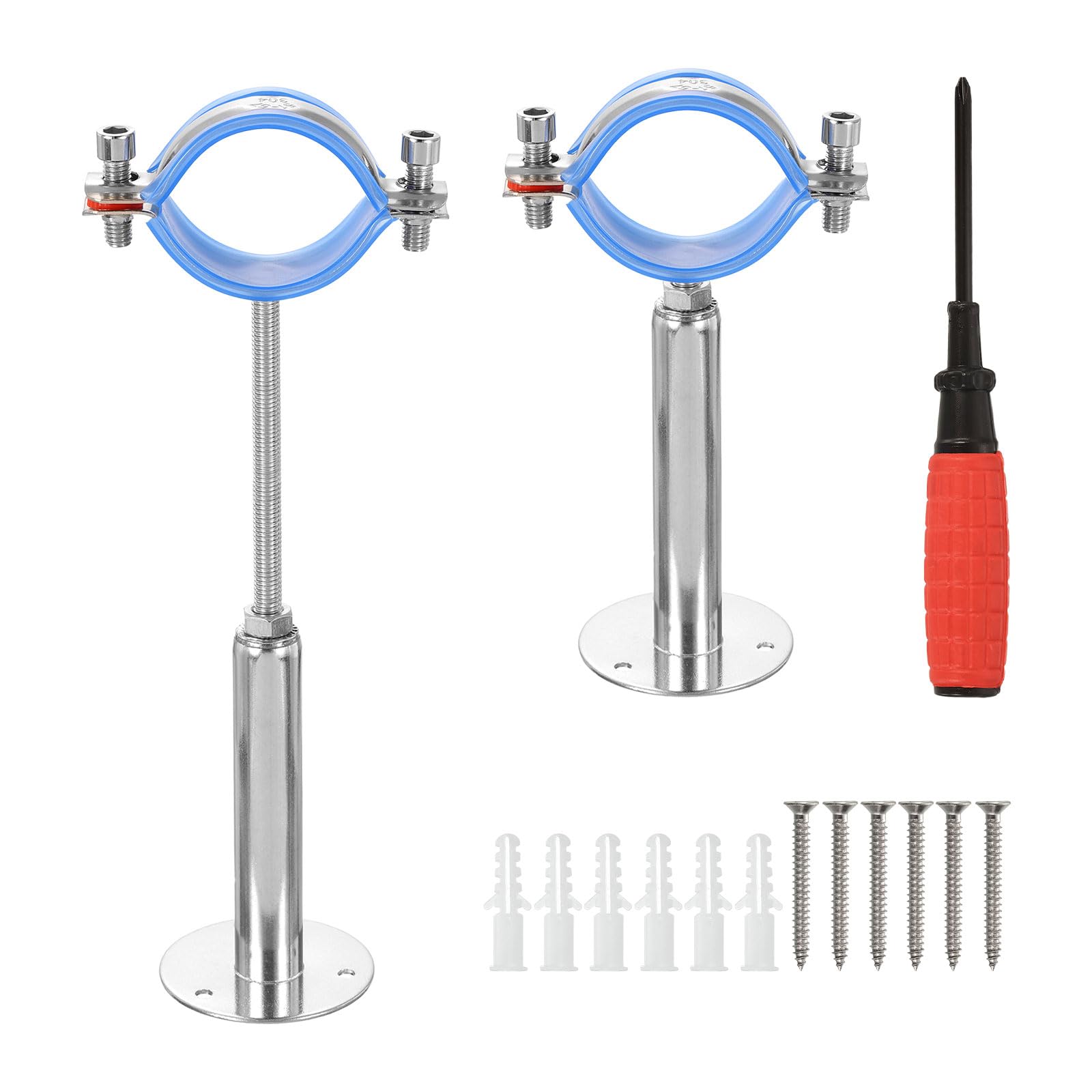 Pour fixer solidement un tuyau, une barre ou un tube contre un mur ou au plafond, ces supports en acier inoxydable 304 sont top. Dans le lot, vous en avez 2, avec tout le nécessaire pour les installer.\n\nIls s'adaptent à des tubes d'un diamètre extérieur de 48 à 51 mm. La hauteur de la base est réglable de 50 à 90 mm, ce qui permet de s'adapter à différentes épaisseurs d'isolation ou de réglage.\n\nLe matériau, de l'inox 304, est résistant à la rouille et à la corrosion, donc utilisable en intérieur comme en extérieur, même dans des environnements humides ou chauds.\n\nChaque support a un coussin en caoutchouc à l'intérieur pour mieux épouser le tube et éviter les vibrations ou les rayures. L'écrou de serrage bloque bien le tout.\n\nDans la boîte : 2 supports, 1 clé M6, 6 vis et 6 chevilles d'expansion. Il suffit de marquer, percer, visser et serrer.\n\nIdéal pour fixer des tuyaux de ventilation, des garde-corps, des supports de rangement, en cuisine, salle de bain, atelier, bureau... Un produit solide, réglable et durable.