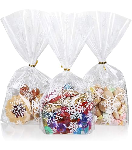 Tu prépares des petits cadeaux ou des gourmandises pour Noël ? Ces sachets transparents sont parfaits pour emballer biscuits, bonbons, chocolats, pop-corn, noix… Ils sont en plastique OPP alimentaire, transparents pour voir le contenu, et imprimés de motifs de Noël (Père Noël, flocons) sur les deux faces. Le pack inclut 100 sachets (13 x 27 cm) et 100 attaches torsadées pour bien les fermer. Tu peux aussi t'en servir pour ranger des petits objets ou décorer ta table de fête. Ils apportent une ambiance festive sans effort. Pratiques, jolis, et réutilisables si tu fais attention. Parfaits pour les goûters d'école, les marchés de Noël ou les cadeaux aux collègues !